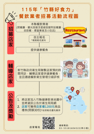 說明:為推廣均衡的健康飲食觀念及少油、少鹽、少糖的健康烹調方式,新竹縣政府衛生局及社區營養推廣中心運用「我的餐盤」六口訣,讓民眾聰明選擇六大類食物以達到健康飲食模式。此外,為了讓社區民眾在選用外食時可以輕鬆享受外食無負擔,特舉辦 「竹縣好食力」餐飲業者招募活動,讓竹縣的餐飲業者可以透過自主參與的方式 ...更多