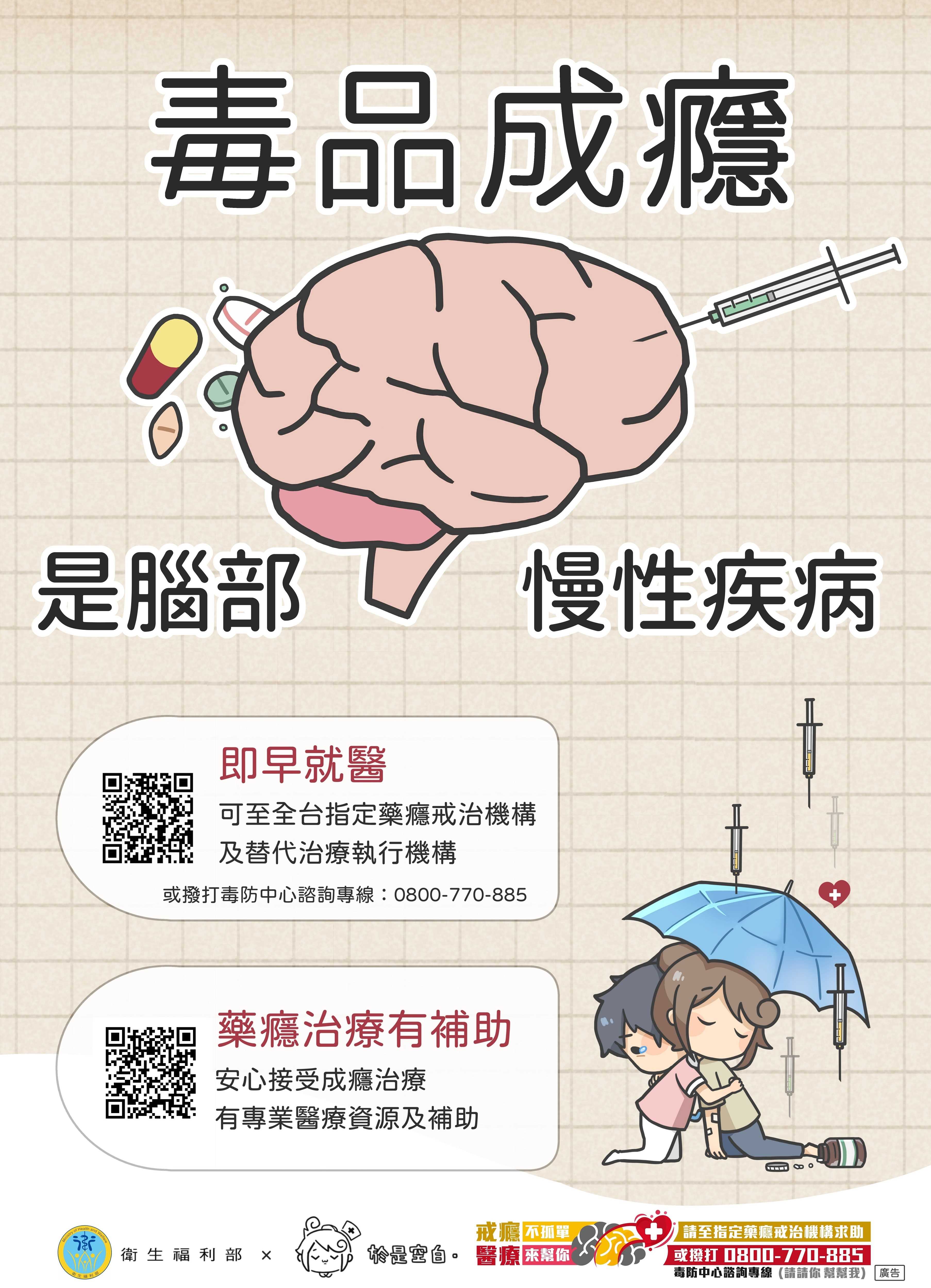 毒品成癮是腦部的慢性疾病 成癮不是意志力的問題,而是一種需要治療的疾病。及早接受治療,有助於回歸健康生活。 及早就醫,重拾人生 請儘早前往指定的藥癮戒治機構或維持治療執行機構尋求協助, 也可撥打 毒品危害防制中心 24 小時免費諮詢專線:0800-770-885,提供專業協助與指引。 藥癮治療有效、有資源 安心接受治療,政府提供專業醫療團隊與補助資源,協助您戒除毒癮、重新啟動人生。