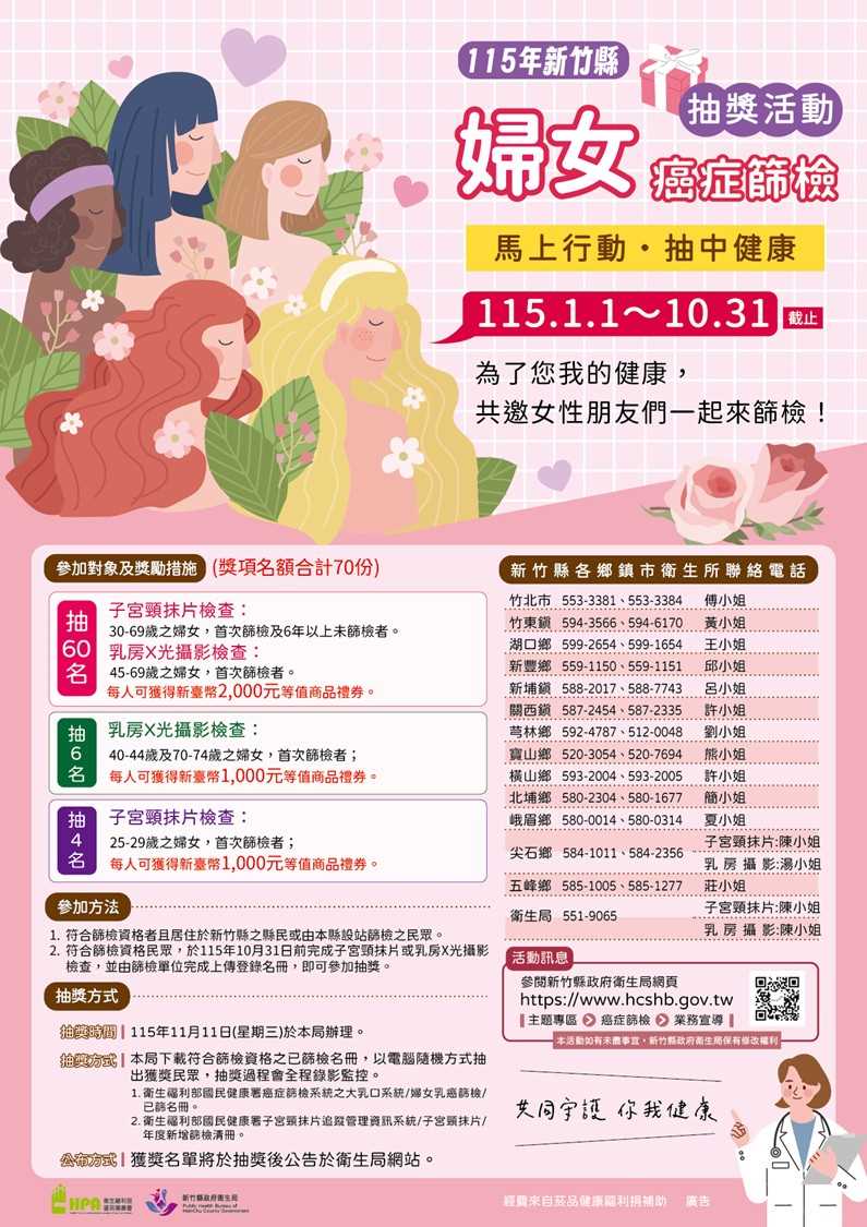 活動對象及獎項 凡設籍或現居住於新竹縣。 「子宮頸抹片檢查」30-69歲之婦女,首次篩檢及6年以上未 篩檢者或「乳房X光攝影檢查」45-69歲之婦女,首次篩檢者 -抽60名,每人獲得一份 新臺幣2,000元 等值商品禮券。 乳房X光攝影檢查:40-44歲及70-74歲之婦女,首次篩檢者 -抽6名,每人獲得一份 新臺幣1,000元 等值商品禮券。 子宮頸抹片檢查:25-29歲之婦女,首次篩檢者 -抽4名,每人獲得一份 新臺幣1,000元 等值商品禮券。 活動期間 活動日期:115年1月1日起至115年10月31日止。 抽獎日期:115年11月11日。