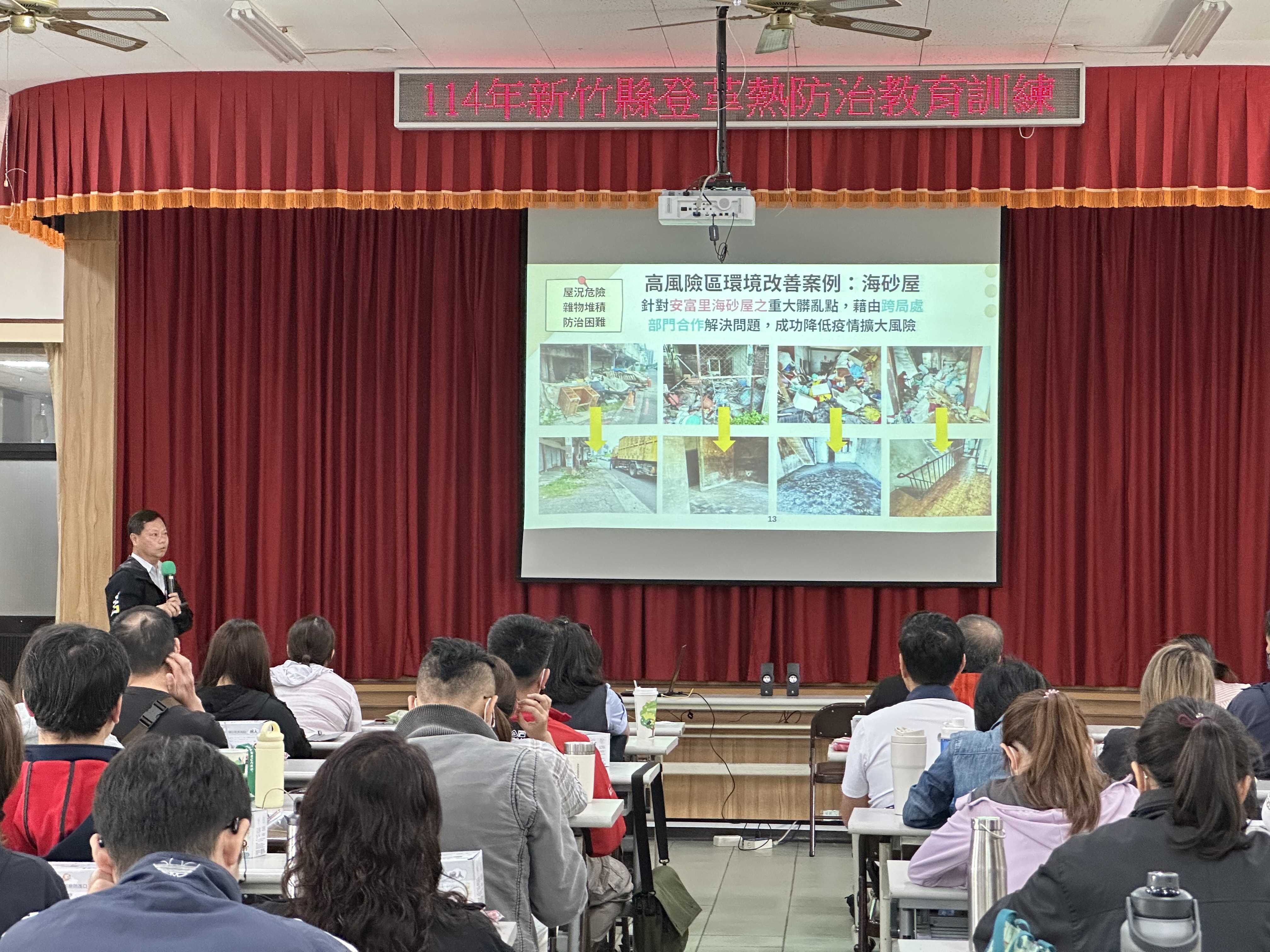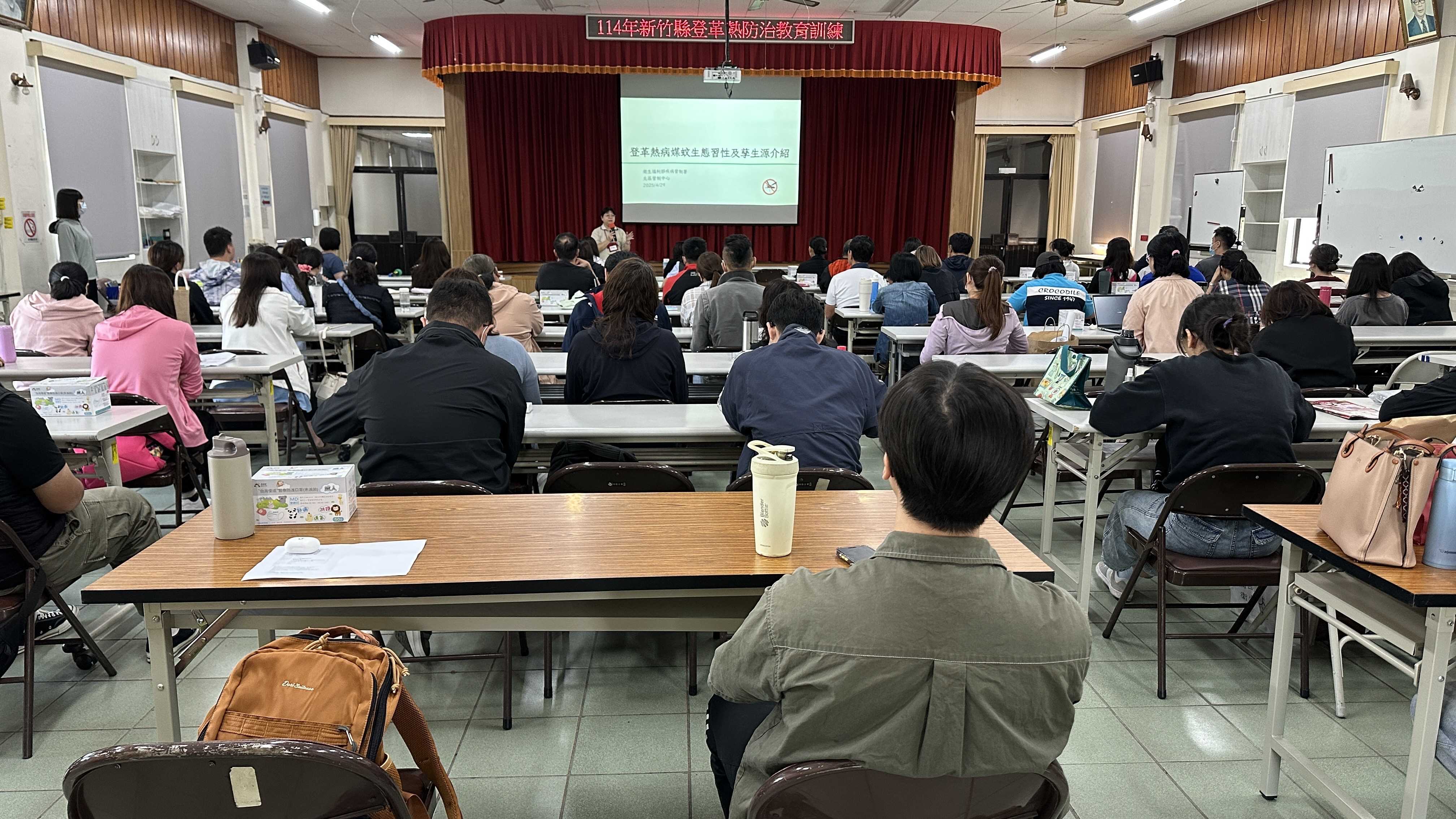 隨著氣溫逐步攀升、降雨頻率增加,登革熱流行高風險季節即將來臨。新竹縣政府為防範疫情擴散,積極啟動流行期前整備作業,新竹縣政府衛生局4月29日舉辦登革熱防治教育訓練,邀集縣府各局處、13鄉鎮市公所及衛生所,各大學院校、國高中小學、外籍移工人力仲介公司及基層診所,總計72人參與,特別邀請具有豐富防疫經驗的疾病管制署北區管制中心江雪美護理師及安南區公所魏文貴區長共同授課,內容涵蓋登革熱病毒傳播途徑、病媒蚊生態特性、社區環境孳清及登革熱防治實務技巧。