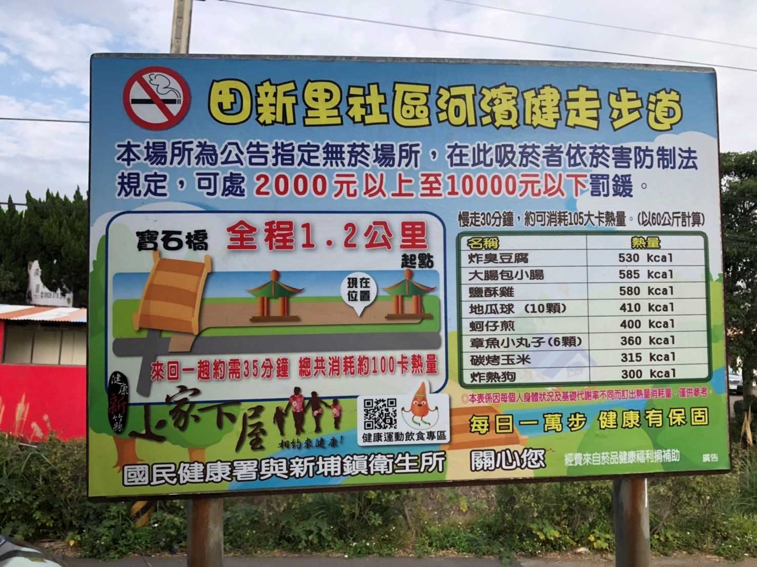 步行方式:健走1趟,運動消耗熱量:約66大卡開放時間:全日停車場:有交通:走北二高在關西交流道下,往新埔方向開9-10km會看見左邊一個全國加油站,過加油站前的霄裡橋後左轉田新路,開到底再左轉中正路,大約20公尺前立刻左轉環河路,路口右邊就是運動公園的入口