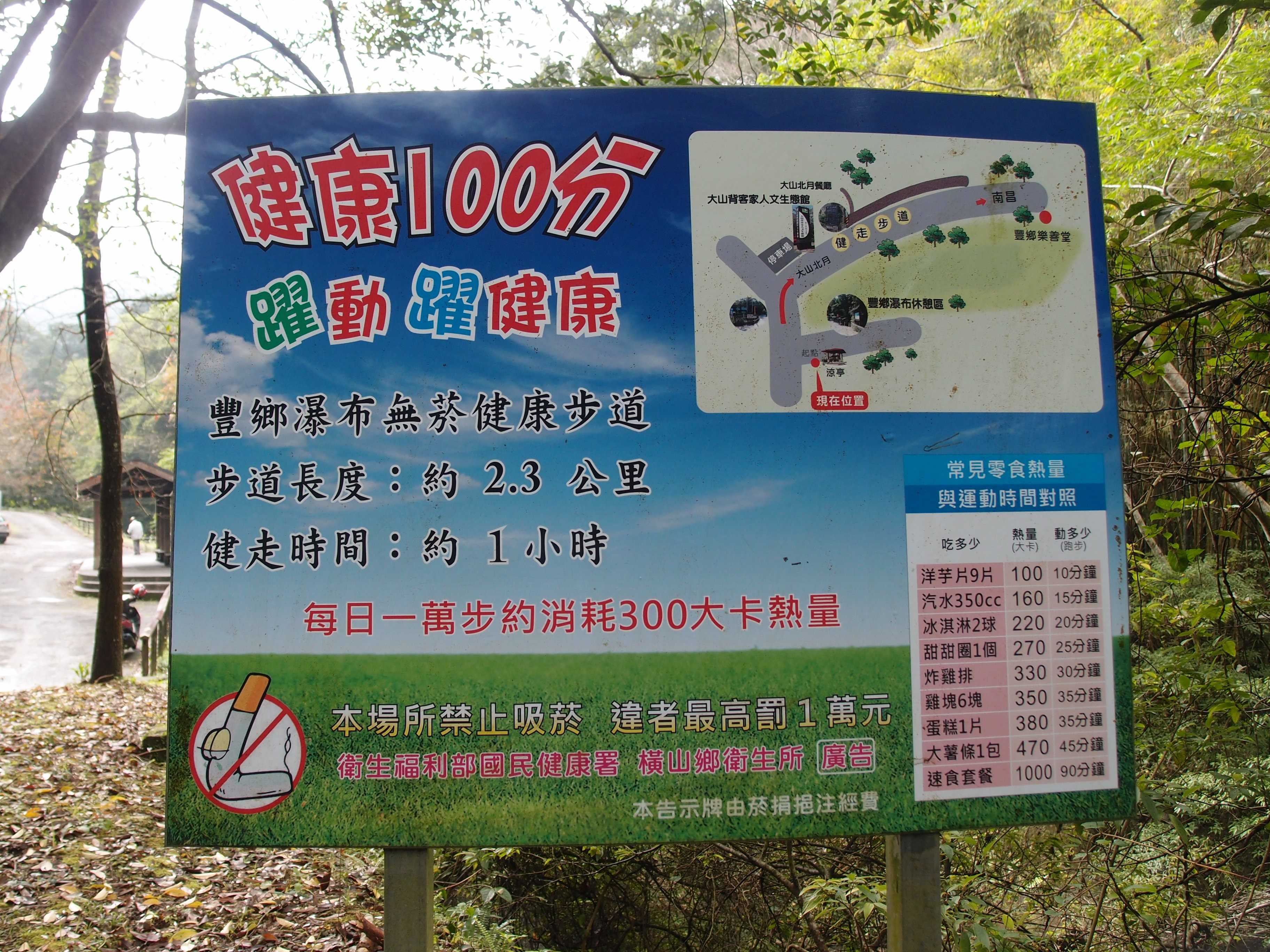 從豐鄉瀑布的停車場出發,沿著馬路上行至小拱橋,過橋之後, 即抵達豐鄉瀑布旁的涼亭。沿著竹35鄉道上行,右側有一座糯米橋,糯米橋附近的道路左側有石階路,通往上方樹林內的伯公廟,沿途風經優美適合全家外出健走。